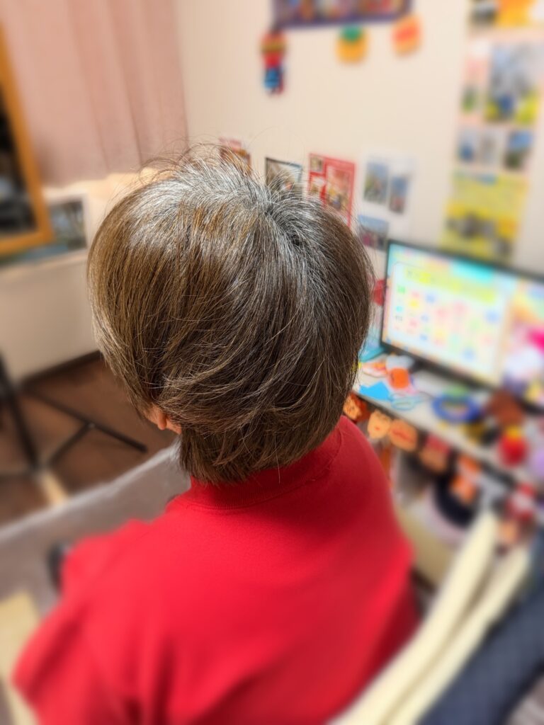 かなり根元が伸びていましたが、ナチュラルに染めて長さもスッキリさせていただきました。